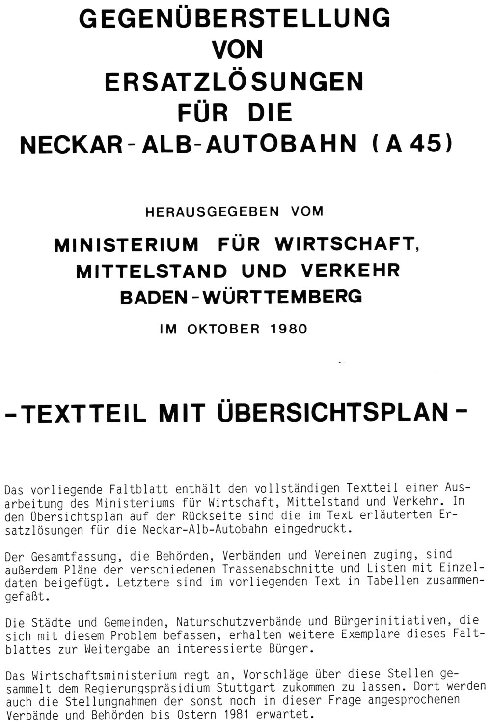Quelle: Regierungspräsidium im Oktober 1980. Ersatzlösungen für die Neckar-Alb-Autobahn (A45).