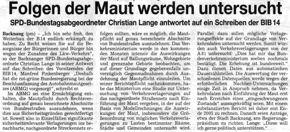 Nur ein halbes Jahr später wird von einer Maut auf der B14 wieder Abstand genommen.
