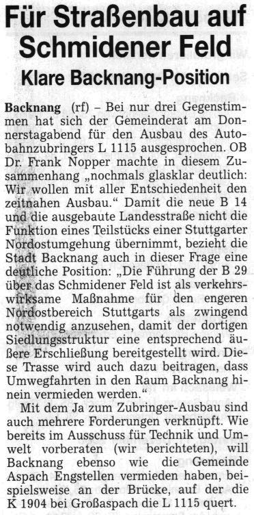 Nord-Ost-Umgehung Stuttgarts, während sich Fellbach-Schmiden erfolgreich gegen